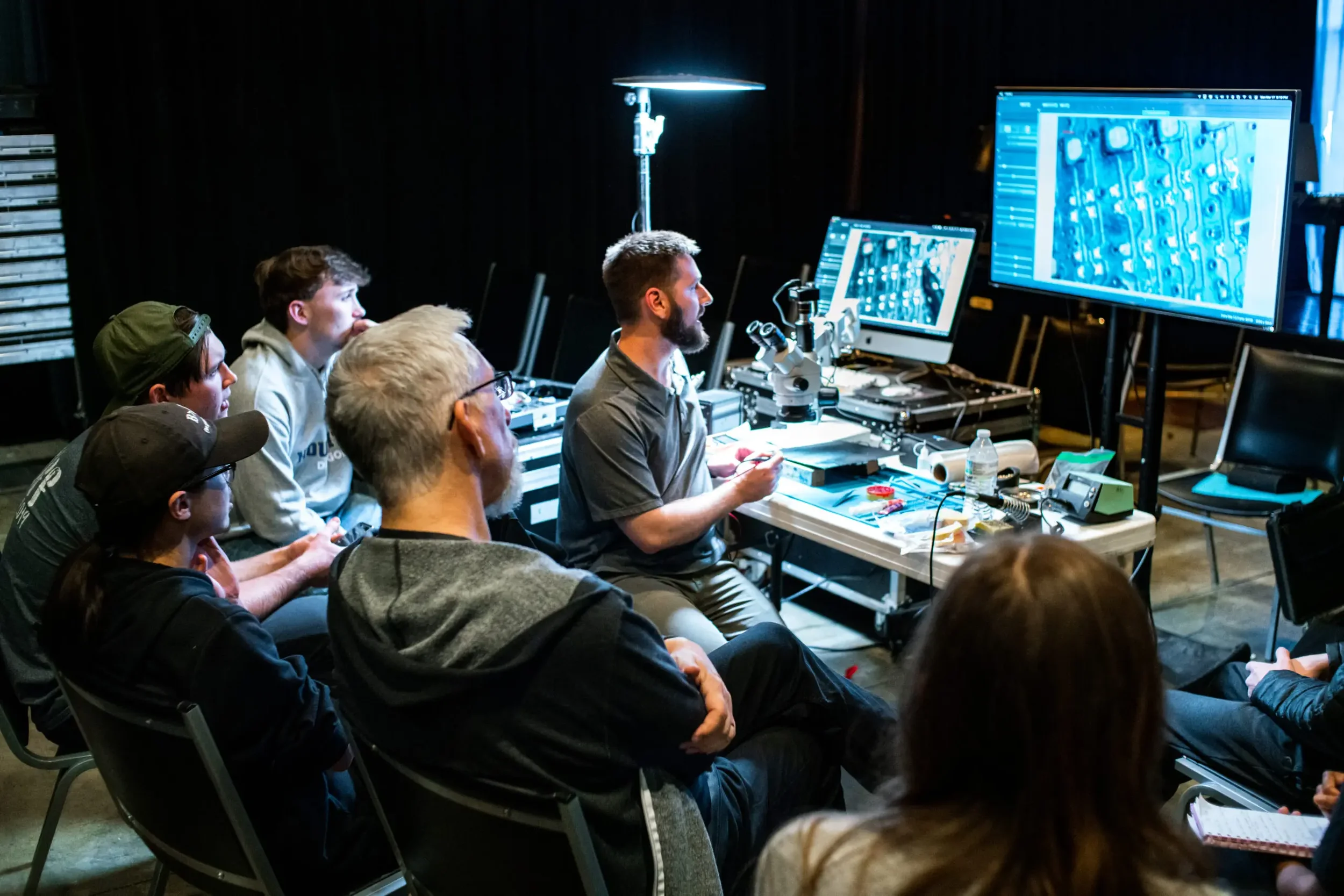 PixelFlex is a Nashville-based company that provides LED display systems for a variety of customers around the globe. CMC has numerous alumni working at PixelFlex either as show technicians on the road or in the shop as product fabricators. Recently, Briton Roberts (Technical/Product Service Manager) came to CMC to give an advanced tutorial on LED panel repair. He demonstrated effective processes for swapping out damaged pixels and replacing missing traces using the ‘shepherds hook’ method.